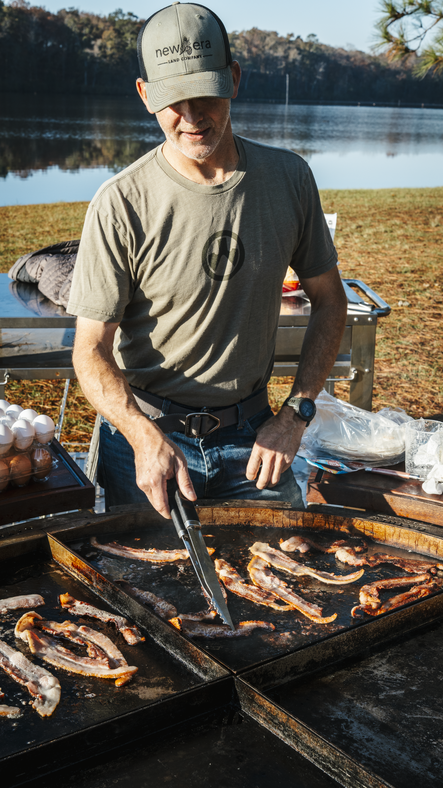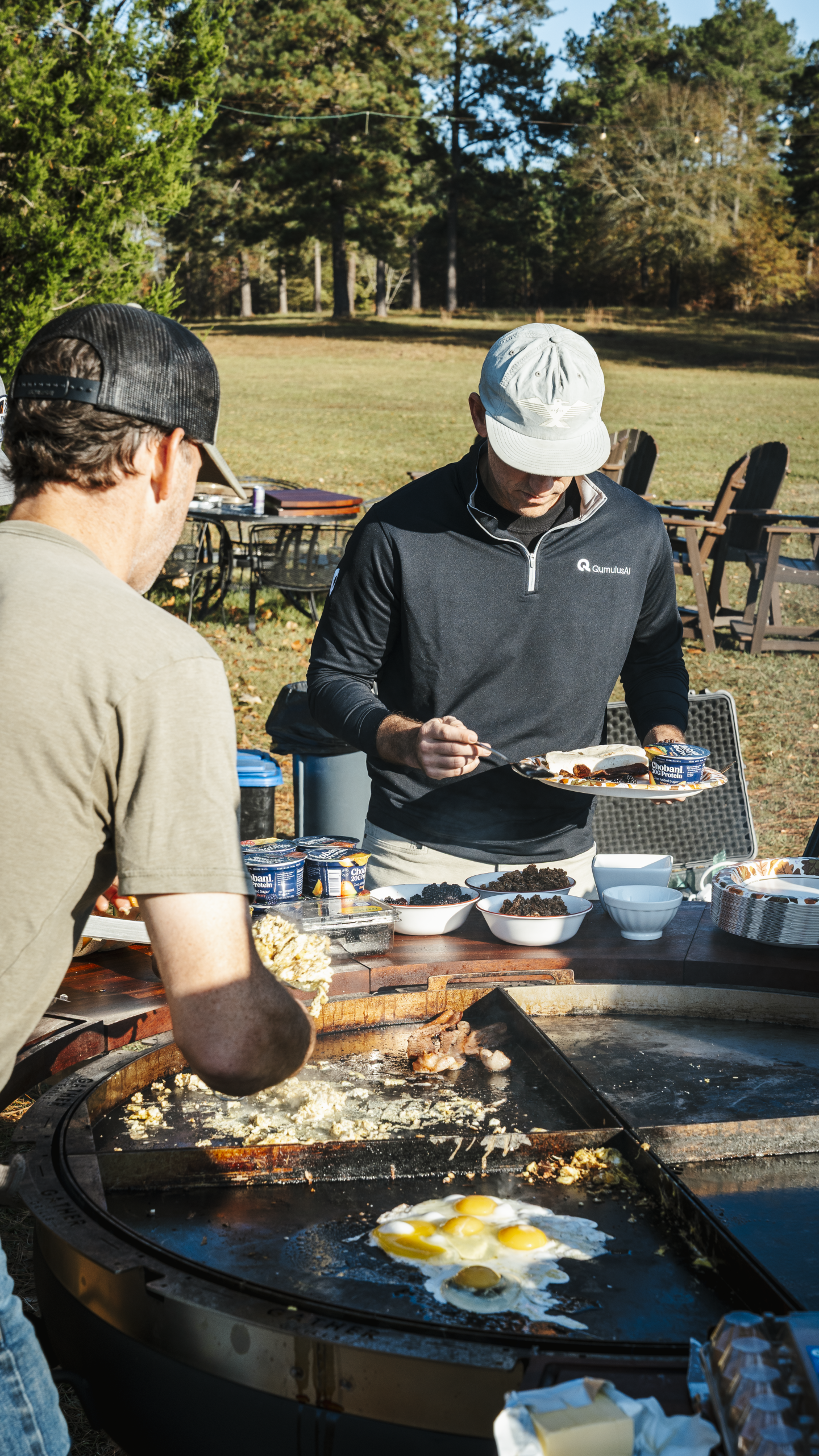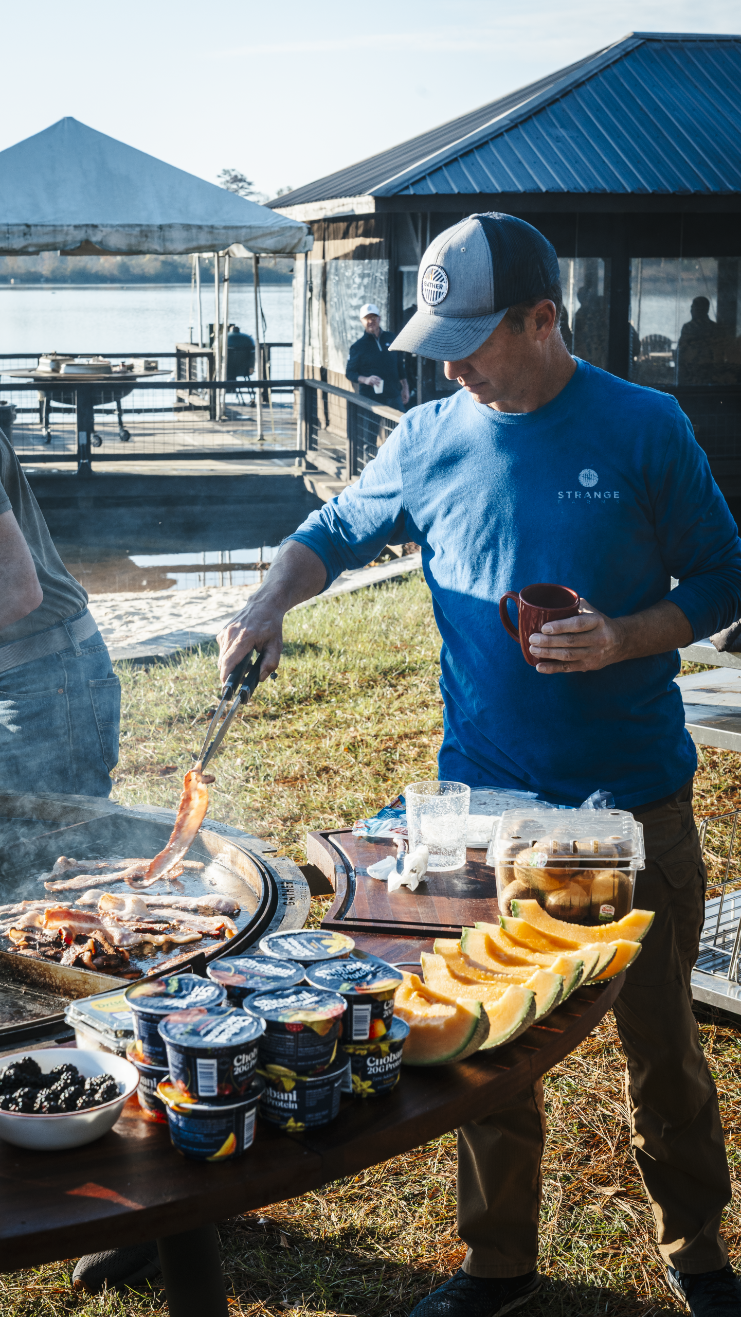 It was a crisp, cool morning out on Strange Farms as we started out the day firing up the Reunion Gather Grill and replacing the grill grates with four interchangeable Griddles to maximize egg and bacon cook time / portions. After which, we set up the outside of the Grill with yogurt, toppings, condiments, and tortillas for the ultimate serve yourself Breakfast Bar only possible on the Gather Grill with the attachable table wings. Man, was it good! (Shoutout to Chef Josh and his crispy egg burrito!)