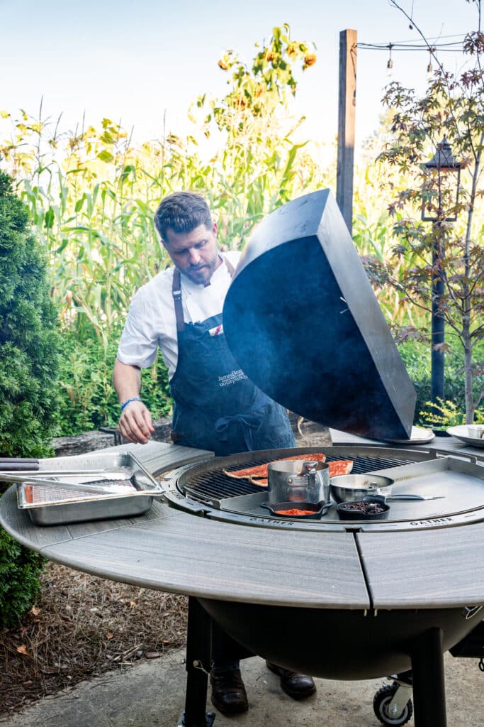 The Gather Grill turns your entire evening into an experience. Cooking dinner becomes a shared endeavor, with people sitting around the table enjoying food as soon as it comes off the grill. The grill and griddle is actually a lazy Susan, so the grill can spin all the way around.